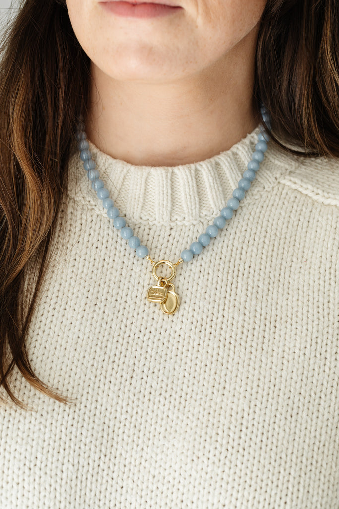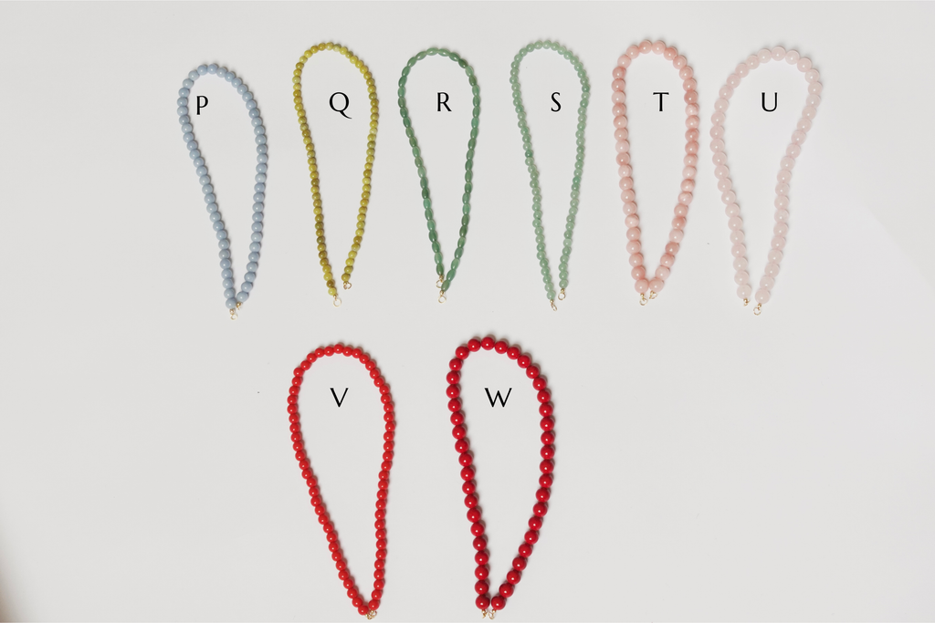 • 18-inch beaded necklaces made from either gemstones, vintage beads, or pearls