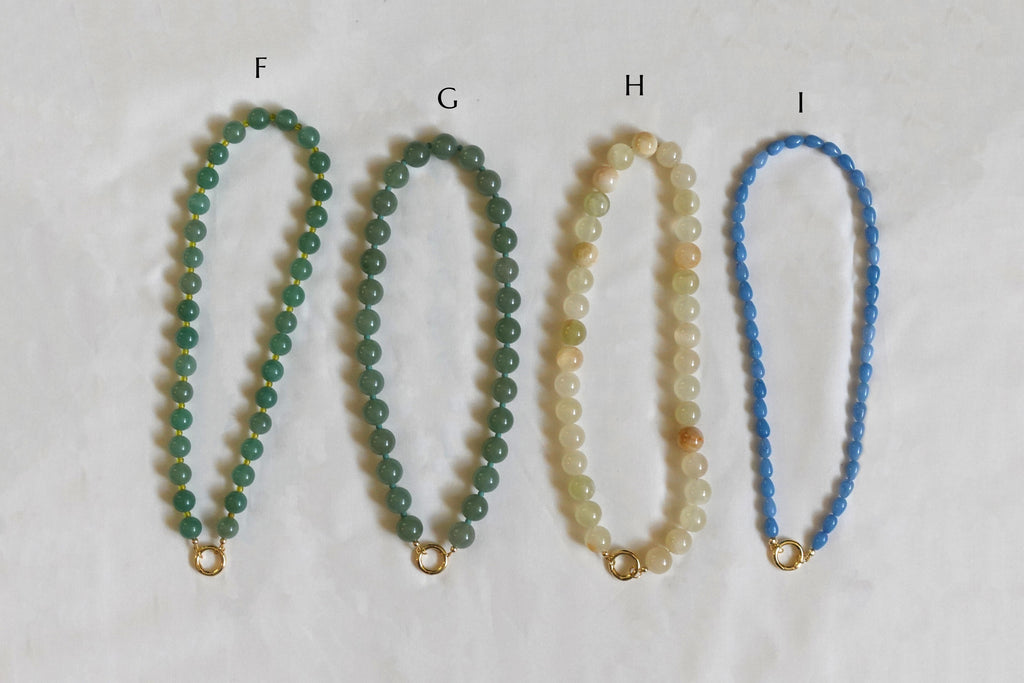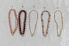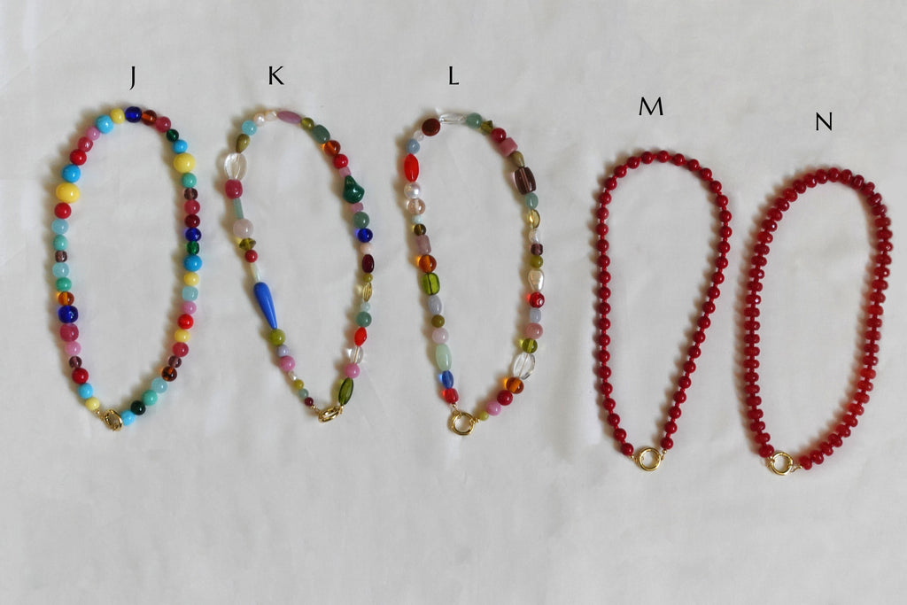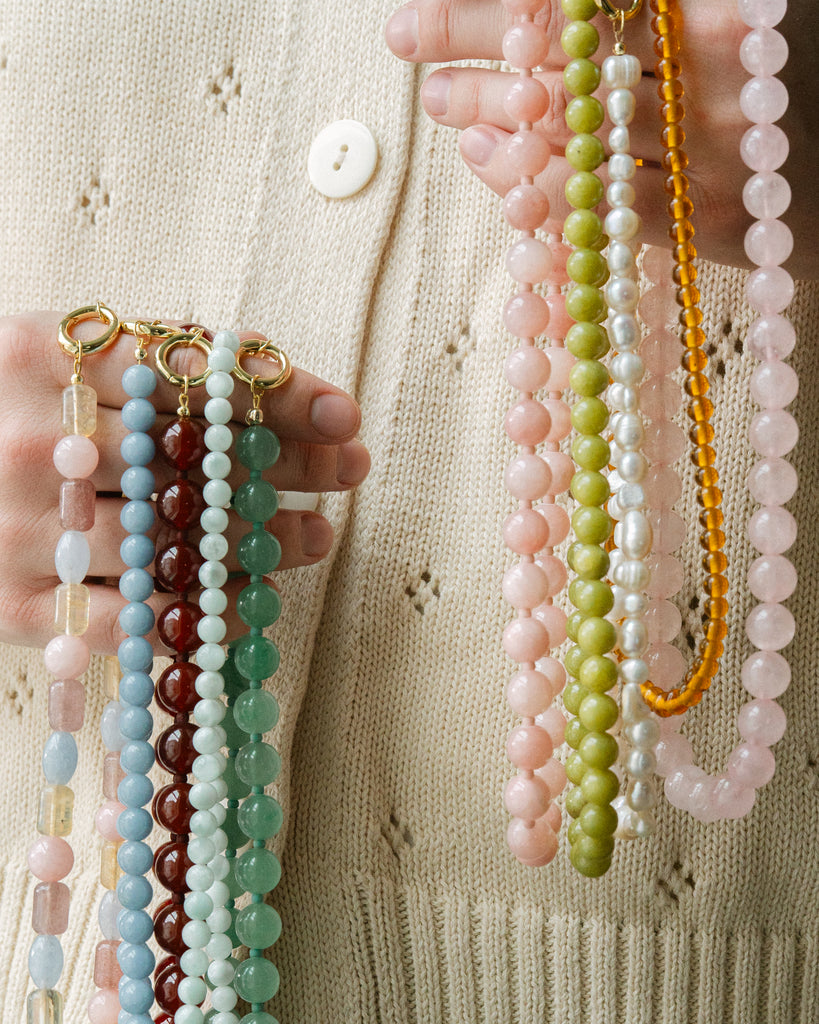• 20-inch beaded necklaces made from either gemstones, vintage beads, or pearls