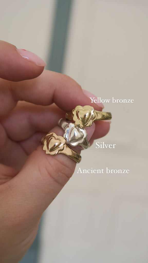 • Rings will come with a polishing cloth to help you maintain its shine as bronze does discolor over time. Read more about how to care for your bronze and silver pieces here.